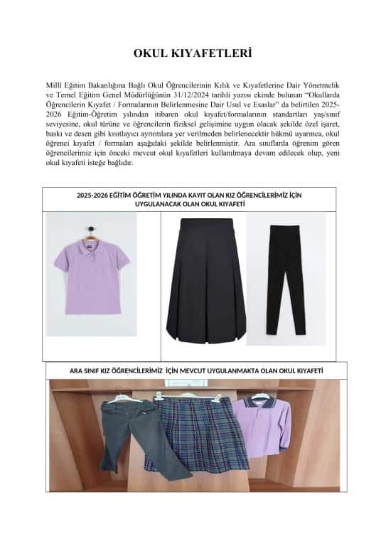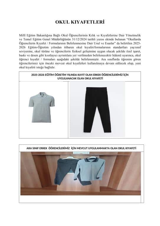 Milli Eğitim Bakanlığımızın öğrenci kıyafetleriyle ilgili değişikliği doğrultusunda Okul Aile Birliği Yönetim kurulumuz ve Öğretmenlerimizle beraber belirlediğimiz öğrenci kıyafetlerimizait görseller.